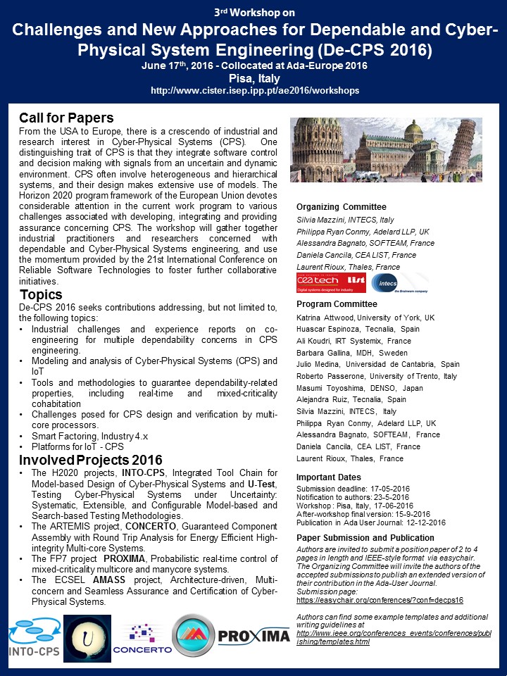 The H2020 project INTO-CPS (Integrated Tool Chain for Model-based Design of Cyber-Physical Systems INTO-CPS) The ARTEMIS project CONCERTO (Guaranteed Component Assembly with Round Trip Analysis for Energy Efficient High-integrity Multi-core Systems). The ECSEL project AMASS (Architecture-driven, Multi-concern and Seamless Assurance and Certification of Cyber-Physical Systems) The FP7 project PROXIMA (Probabilistic real-time control of mixed-criticality multicore and manycore systems) The H2020 project U-Test (Testing Cyber-Physical Systems under Uncertainty: Systematic, Extensible, and Configurable Model-based and Search-based Testing Methodologies)